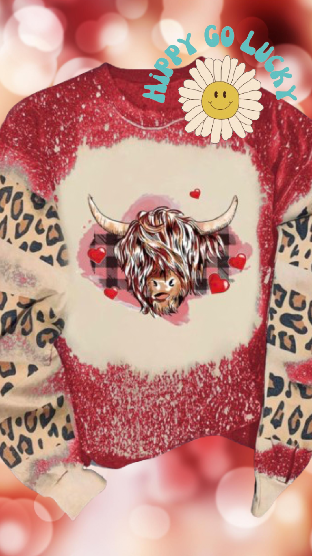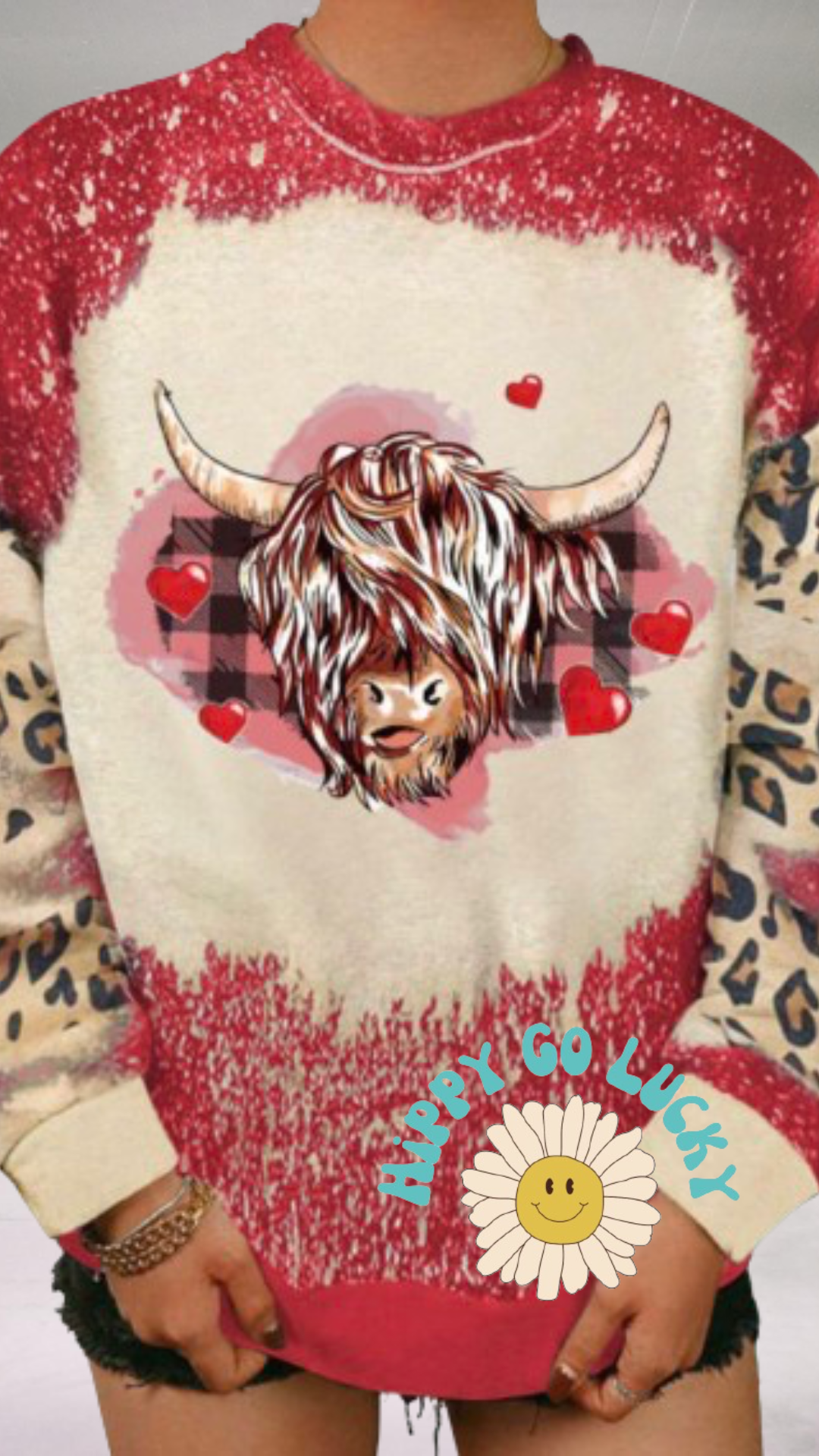 Red heifer valentine sweater bleached with leopard on sleeves